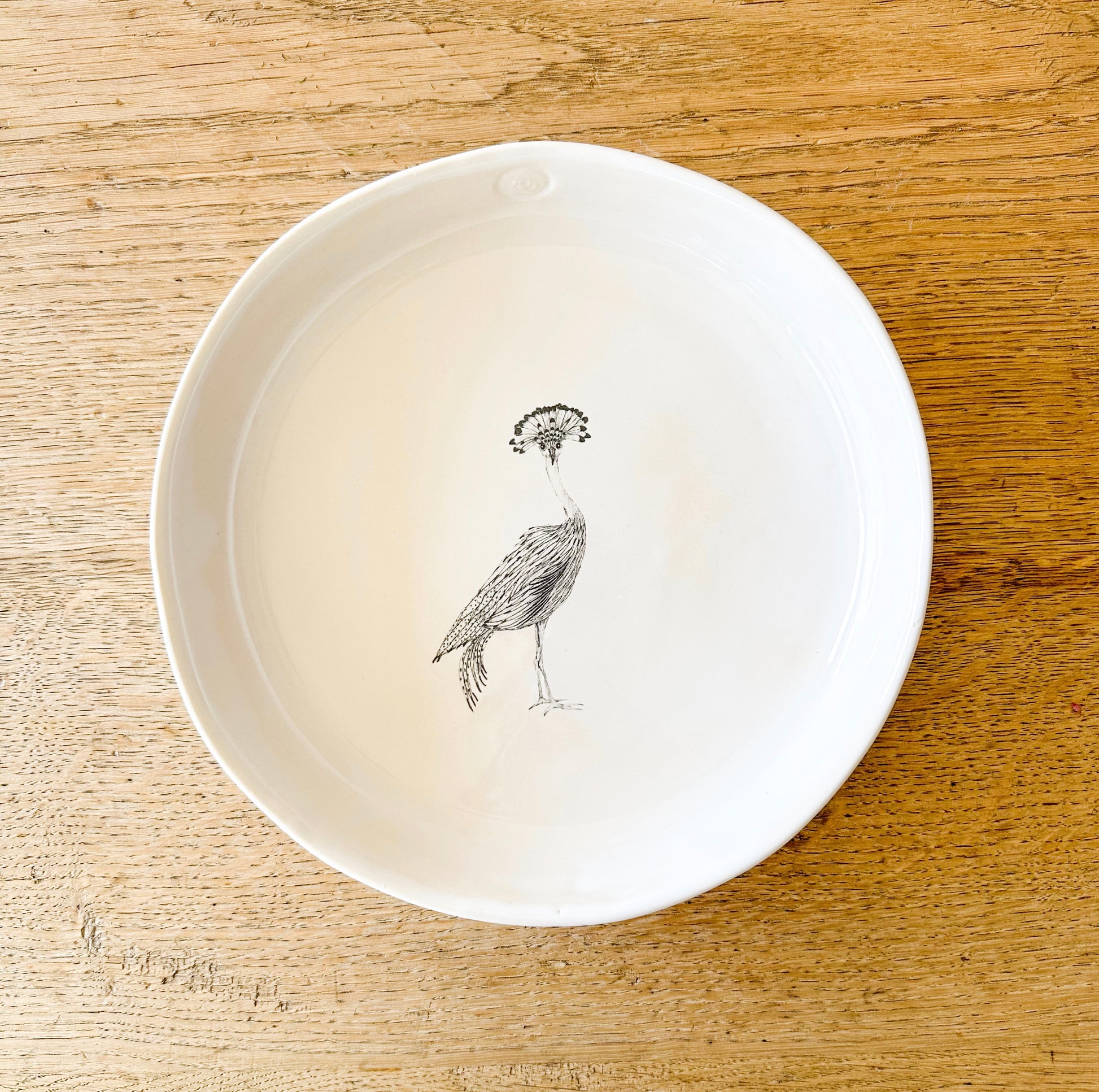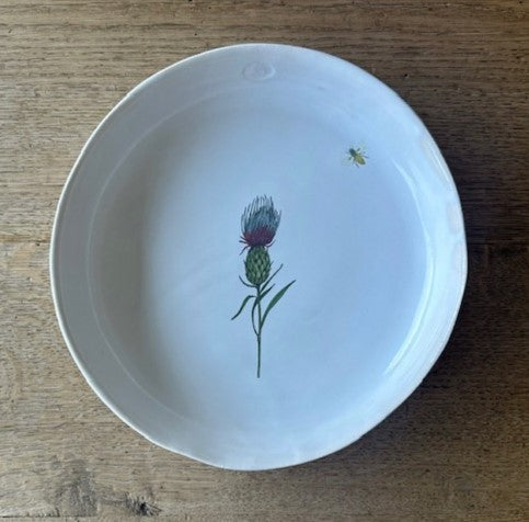 Fuente redonda esmaltada en blanco brillo, con estampación de un sello antiguo y posibilidad de poner distintos motivos de bicho, jardineros o garzas. Los dibujos están realizados por la reconocida ilustradora y acuarelista Sena Cifuentes. Es una pieza muy resistente, apta para lavavajillas y horno.